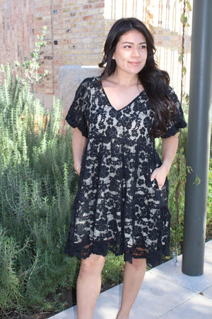 This Brianna Lace Babydoll Dress is a must-have it features a flattering V neck design and delicate lace detailing, this dress offers both style and comfort.