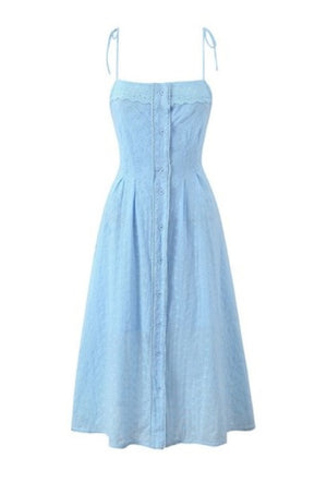 Our Serena Embroidered Button Down Spring Dress is made from a light and airy fabric, this baby bright blue dress features a delicate, embroidered floral design and self tie bow straps for a feminine touch. Perfect for Spring.