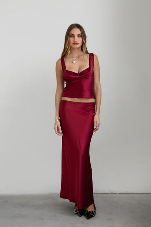 Add a touch of elegance to your wardrobe with our Megan Burgundy Maxi Satin Skirt. The stunning burgundy color and maxi length create a timeless look that is perfect for any occasion. Made from high-quality satin, this skirt offers comfort.