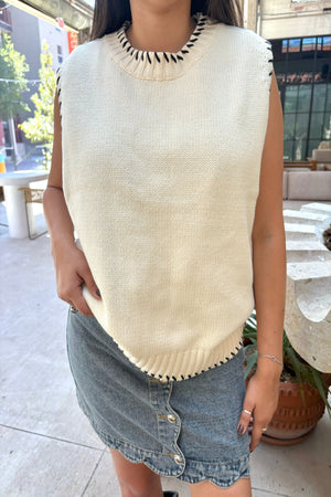 A cozy and stylish essential with a modern edge. This relaxed-fit top features bold black contrast stitching around the neckline, hem, and sleeves, adding a touch of definition to the soft, knitted design. Its oversized silhouette offers both comfort and style, making it an ideal choice for any season.
