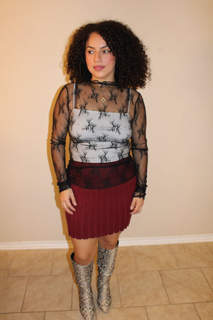 Elevate your layering game with our Josie Mesh Lace Long Sleeve Top. The high neckline and sheer mesh construction create an effortlessly chic silhouette that works as a standalone piece or layered under your favorite outfits. Delicate lace detailing adds texture, while the long sleeves provide versatile coverage.