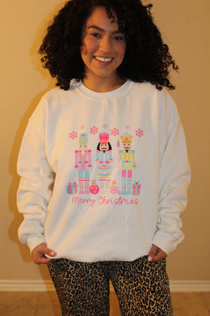 Celebrate the season in festive style with this charming nutcracker graphic sweater. Featuring a vibrant, colorful nutcracker design paired with cheerful "Merry Christmas" messaging, this piece brings traditional holiday spirit. The eye-catching graphics make it perfect for holiday gatherings, casual celebrations, or cozy winter days at home.