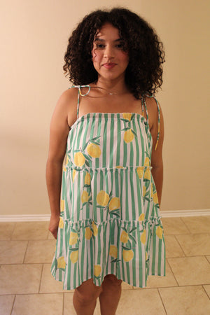 Adara Striped Lemon Dress will brighten your wardrobe with its charming striped dress featuring a playful lemon print. The ruffle square neckline and adjustable self-tie spaghetti straps offer a flattering, customizable fit. Double-lined and non-sheer for confidence and comfort, this dress drapes beautifully with a relaxed, flowing silhouette. Perfect for warm weather styling, the unique print makes it a standout piece that works for casual outings or weekend adventures.