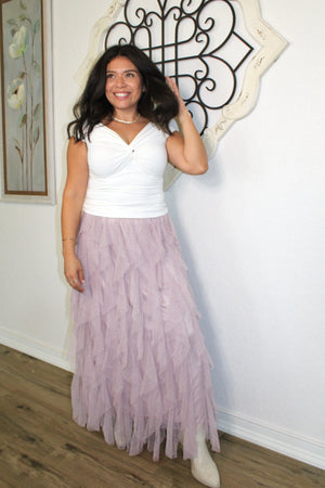Add a coquette piece to your wardrobe with our Danyel Ruffled Maxi Skirt. Made from delicate, dotted tulle material, this maxi skirt offers beautiful ruffled detailing that will have you standing out in style.