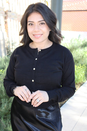 The Kelsey Cozy Cardigan is a must-have for any wardrobe. This black long sleeve cardigan boasts soft, cozy material for ultimate comfort. The pearl flower shaped buttons running down the front add a touch of elegance.