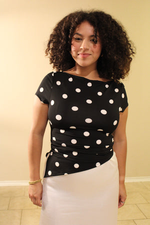 The Maurice Asymmetrical Polka Dot Top features a timeless polka dot print with a modern twist. The asymmetrical cut and side split hem create an effortlessly chic silhouette that flatters and moves with you. Crafted from stretchy material, this fitted top offers comfort without compromise. Perfect for dressing up or down, it's a versatile piece that transitions seamlessly from day to night.